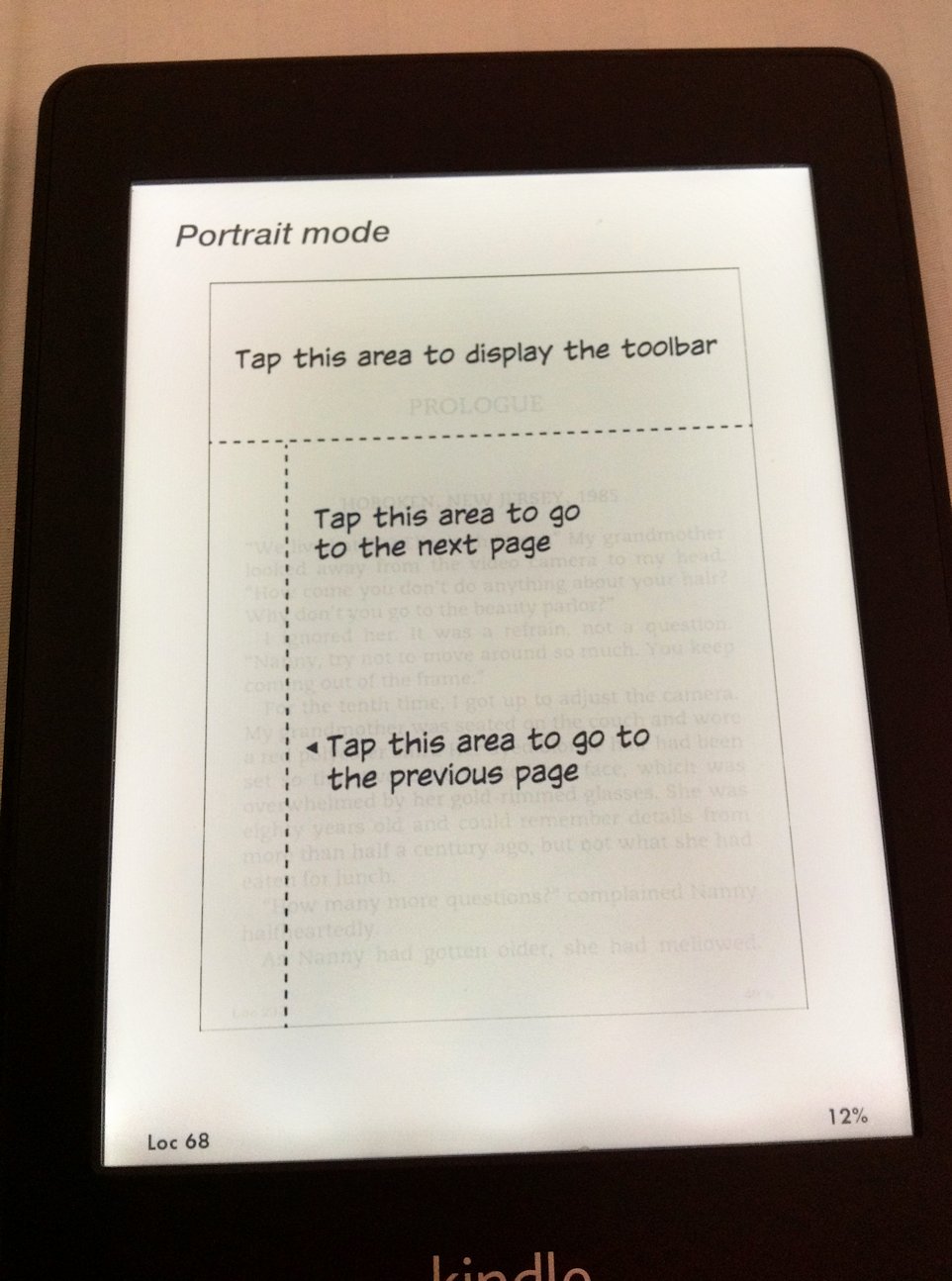 Taken with iPad camera. (Sorry, that's all I got.) Photo unedited but scaled down for sanity. PW light @ 16 in room plenty bright enough to read a normal book in, but a little dark for eink, hence a good test scenario. |