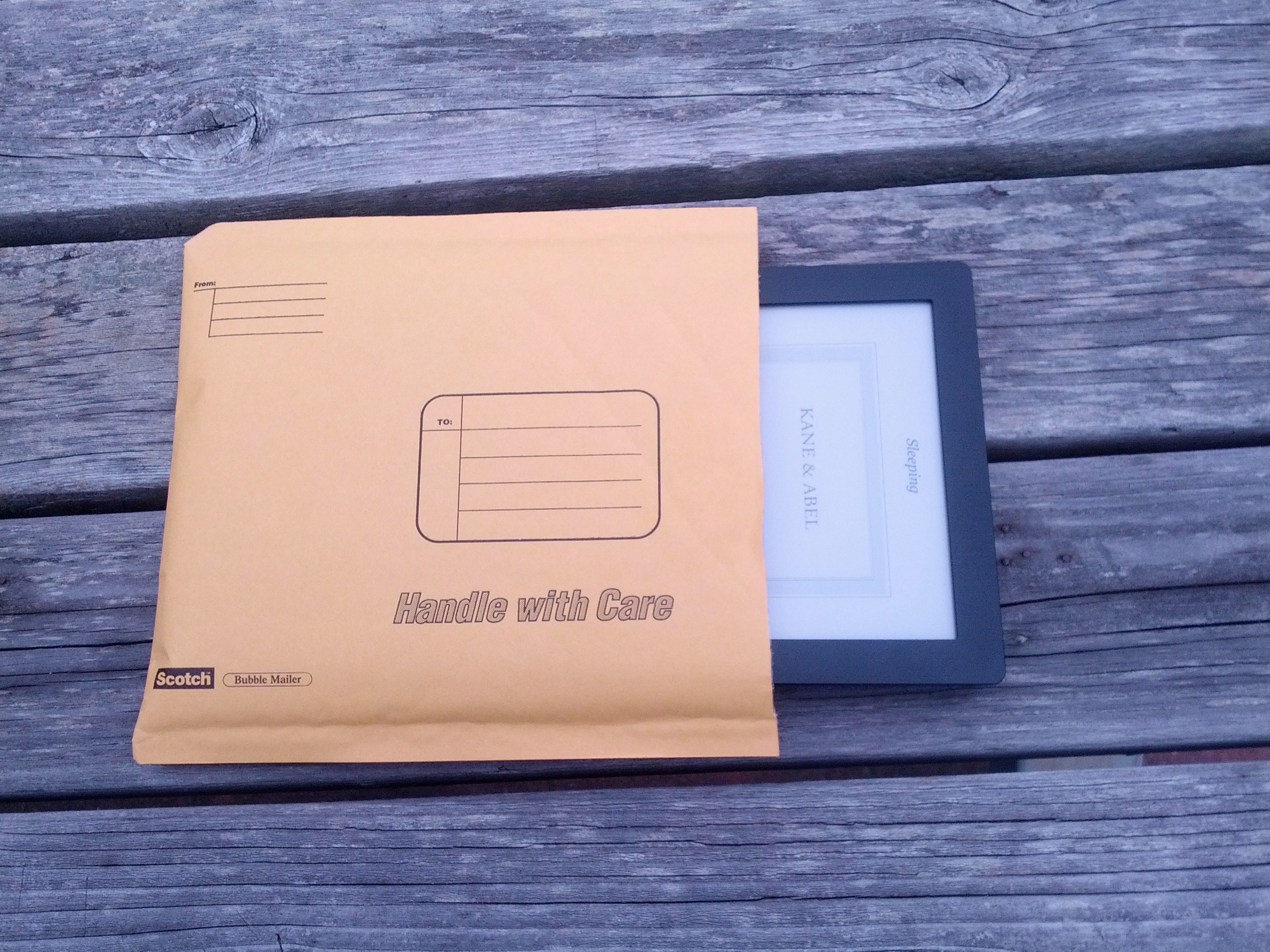 For me, the size is just right. I have several other (6-inch) readers, and this is just the right amount bigger to make me really happy ![]() But.... the darn thing won't fit in my Kobo Glo sleeves! (of course.) So had to come up with an emergency sleeve, just to keep her safe after I'm done reading each night, and to be sure we're both tucked in snug and tight. After a quick snip of the scissors (not shown), these snapshots show the official tucking in... And all is well |