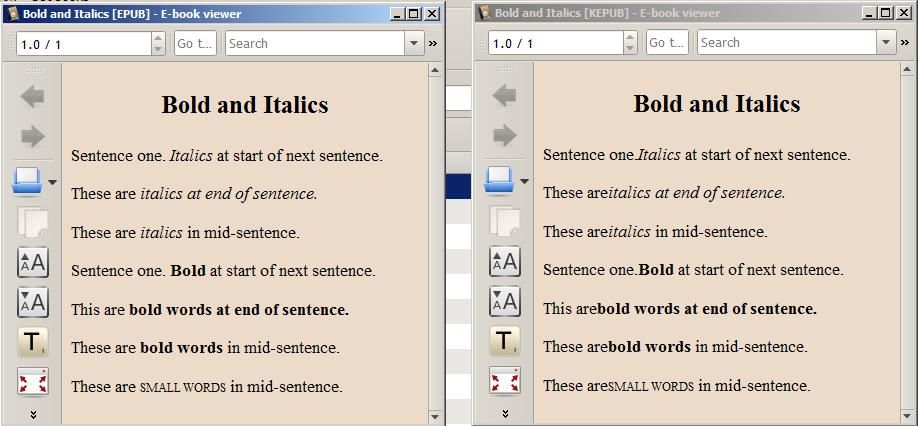I've just updated to v2.6.0 of the Kepub Output plugin and I'm seeing a problem with spaces being lost when doing a calibre convert from epub to kepub. The pic below illustrates the problem with spaces going A.W.O.L before inline tags such as <i>, <b>, <small>. I haven't tested <a>, <em>, <strong>, <big> but I'm guessing they may have the same problem. I've attached a small test source epub in case it helps. |