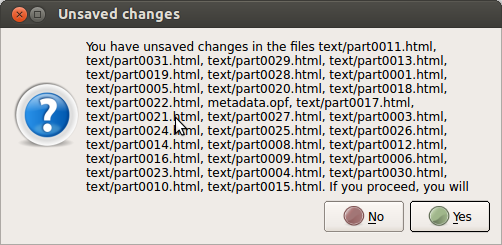 The message not displaying properly was caused by html not being escaped, also fixed. You get the message about unsaved changes if you have editors open with unsaved changes in them. Those changes could have been generated by a previous global S&R operation, for example. Renaming files changes file contents since all links and references to the file throughout the book have to be updated. Last edited by kovidgoyal; 12-01-2013 at 10:56 PM. |