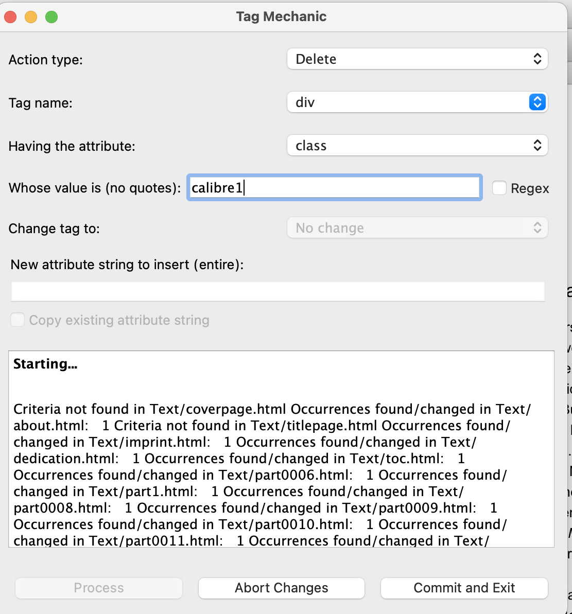 When you click on "Copy exisiting attribute string" and then change the target attribute, the text box becomes writable again. Same thing if your change the target Tag. Feature suggest: When your choosing the <p> as target Tag, it would be nice if in the output/conversion option you could choose <h1>,<h2> or <h3>. Too often, during conversion (or because the ePub is badly built) <p> tags are used for headings. Also, I don't quite understand "New attribute string to insert (entire)": Does it replace the old value? or does it insert a value MORE than the old value? In any case, personally it didn't work. All the <span> I've processed have become 'naked' (bug?). EDIT: I hadn't seen the Config button (for the <h1>,<h2>...). A image of it and the associated window in the main computer would be useful, especially for non-English speakers (visual presentation). (thanks BeckyEbook) Last edited by un_pogaz; 11-01-2020 at 05:24 PM. |