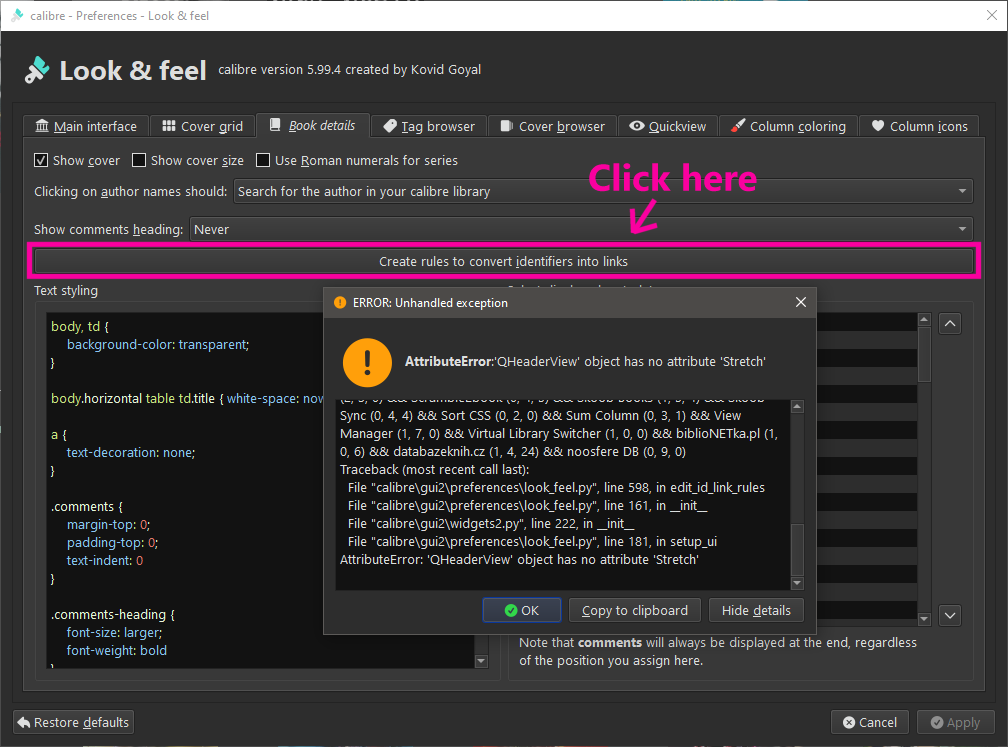 calibre 5.99.4 In a plugin using your Dialog class (from calibre.gui2.widgets2 import Dialog), I still get the error you just corrected in the post 110. After some debug of my code, I found that it is because I use bytearray(self.saveGeometry()) in a dict of dict, instead of a simple dict. I don't know if it worth for you to correct it, in anycase I can work this around easily. example of code : Code: