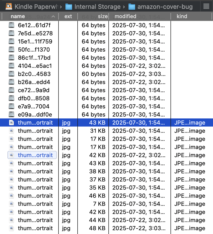 I’ve seen a lot of comments about MTP lately, but so far I’ve had no issues connecting with an MTP client on my Mac. Calibre works just fine too, all my ebooks and periodicals can load onto my 12th gen PW and behave exactly like they did on my previous Kindle. I can even see the system and cover-bug folders with the .jpg files in them. As a quick test, I also loaded two ebooks: one marked as PDOC and one as EBOK, and both showed the covers without any problem. (For context, the EBOK was just a random blog post I downloaded as an EPUB and converted to KFX, so it’s not an actual Amazon book.) That said, just a heads-up: my Kindle stays offline and is running firmware 5.17.1.0.4, so things might be different once it’s connected to the internet. |