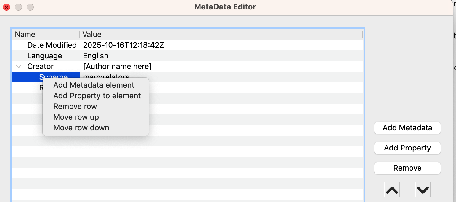 Put your mouse away. Tab to the Add Metadata button, press Enter, select Author, now count the tabs you need to press in order get back to the tree to enter an author name… in Windows I count nine, ditto in an elderly Linux Mate. If the actions that the buttons provide were in the tree context menu, I could ignore the buttons. BR Last edited by BetterRed; 10-16-2025 at 12:17 AM. |