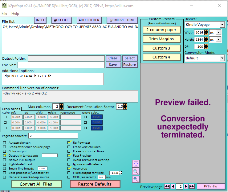 K2pdfopt v2.42 is released. This revision adds bitmap file output (see -o option), dewarping (like ScanTailor, see -dw option), better auto-cropping (-ac option), and Kobo Aura One device dimensions. See details at the web site.