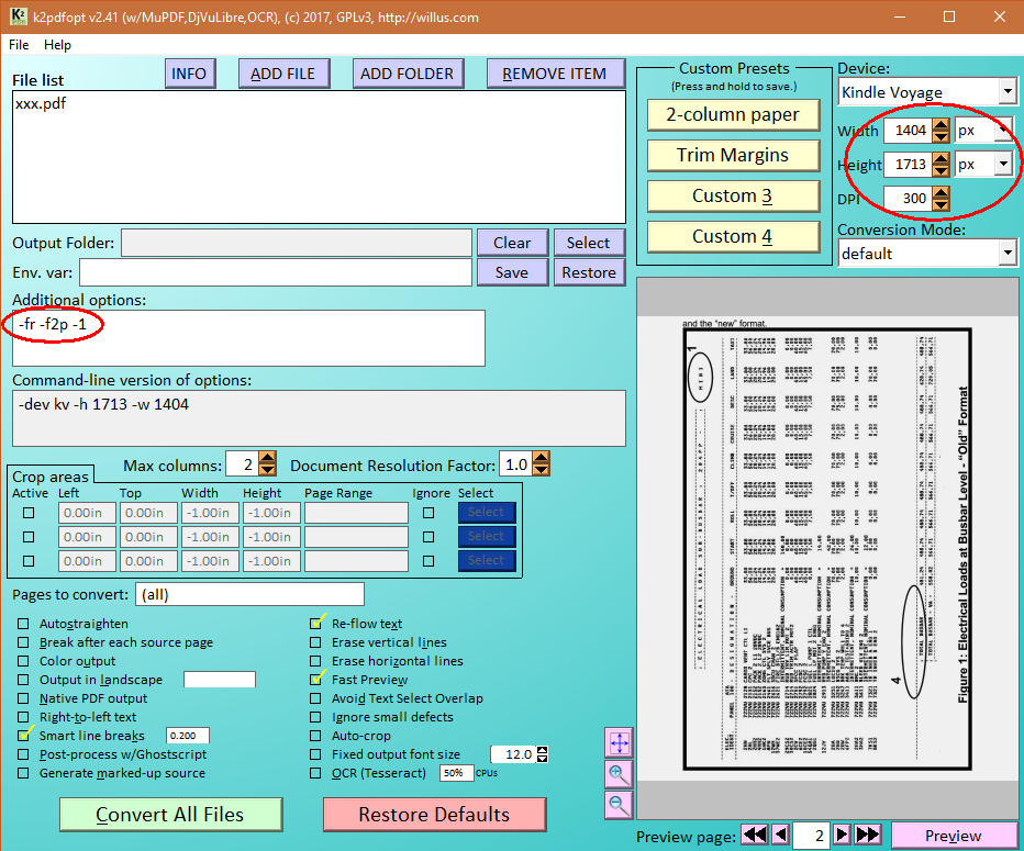 k2pdfopt -mt 1 tcas.pdf There are some captions that get separated from figures (there's a lot of space between the figures and the captions in this document, which is unfortunate), but not too many. You might add -fr if you want wide figures rotated to landscape view. You can also add -sm if you want to see how k2pdfopt is parsing the pages. |
