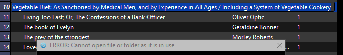 a) double-clicking in Cover grid view is unaffected. b) it doesn't happen when the event "Book List Double Clicked" is unchecked. Now I'll try to explain. I have a chain with the following actions, kindly provided by ownedbycats, that runs on event "Book List Double Clicked": - open book - set #lastread - Increment #timesread - add date to #readdates On list view, when I double-click the title of a book that contains a PDF format (which is my default "preferred input format" in Behaviour preferences, for double-clicking priority purposes), it runs the chain fine, sets all fields correctly. However, when I task-switch back to Calibre from my default system PDF program, the title cell shows as if waiting for an input, I mean, it's been inadvertently selected for editing, as if I had pressed F2. What happens next is that, even without making any changes to the title field, when I click anywhere outside the title cell, I get the message in the attached log - "PermissionError: [WinError 32] The process cannot access the file because it is being used by another process" Also, that will occur either when I have the tweak doubleclick_on_library_view set to 'open_viewer' or to 'do_nothing'. Since I started using this chain, I use the latter (do_nothing). I wonder if some tweak to the "Book List Double Clicked" event or to the chain itself could prevent that? Last edited by Comfy.n; 08-19-2024 at 04:43 PM. |