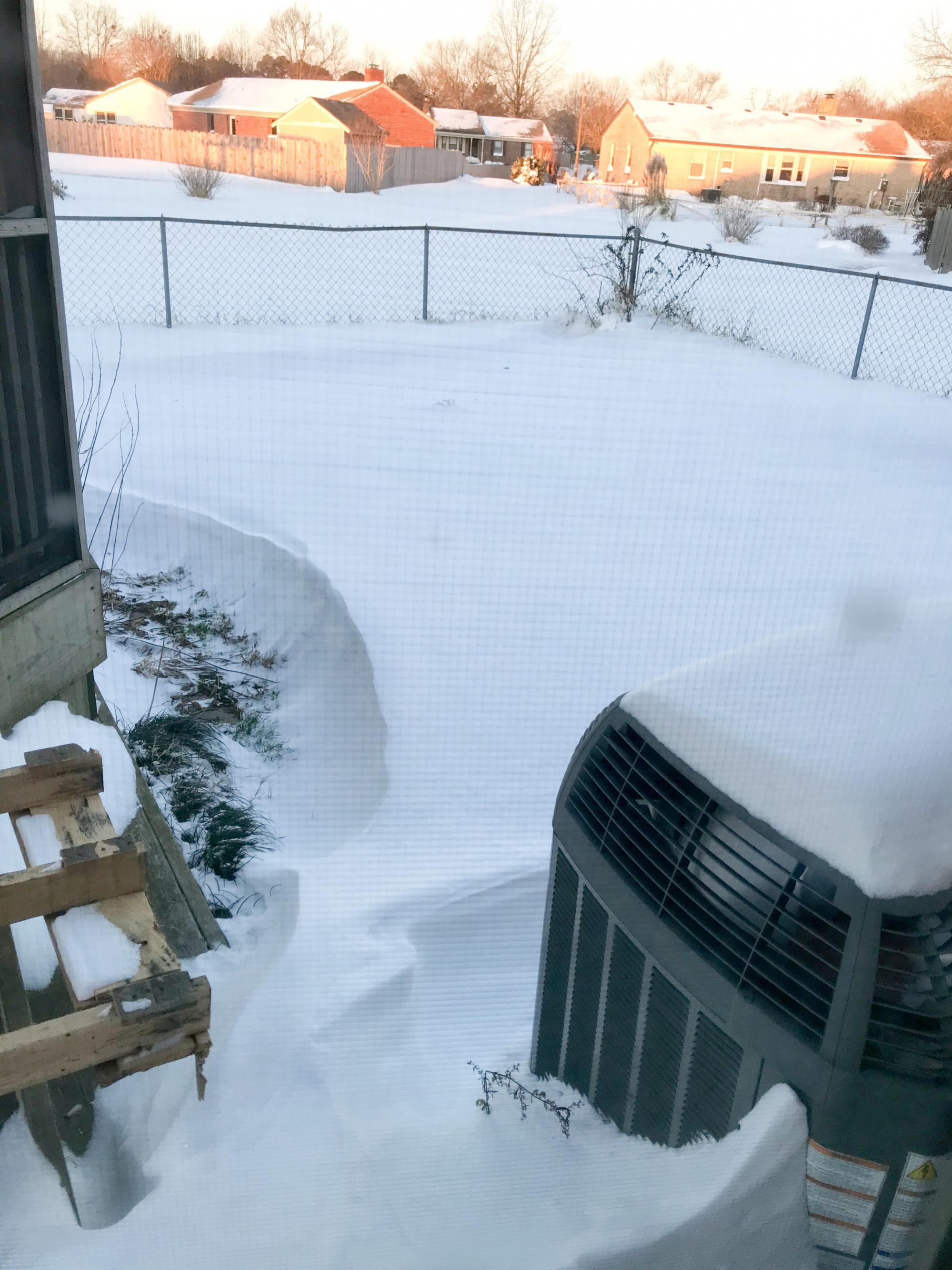 Currently 9°. It's officially cold in Tidewater. The snow is going nowhere. Here's the view this morning from our rear window: