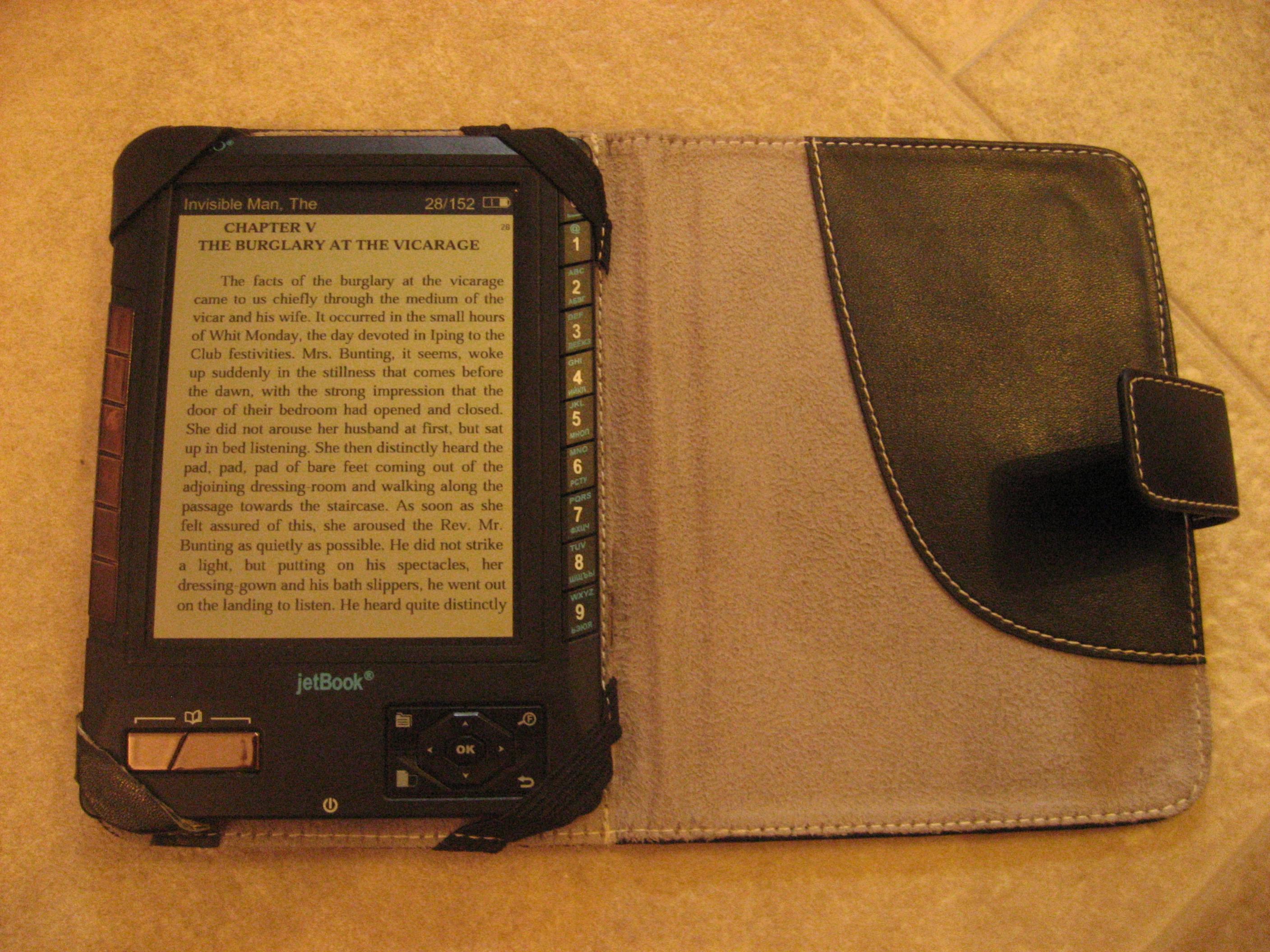 USA Only please. I am selling a lightly USED black Ectaco jetBook. It includes a sony slipcase for a prs-300 because I must have accidentally sent the Ectaco silpcase with a prs-300 I sold and a non-sony cover for a prs-300 that I slighly modified. See photos. It also includes the original box, AC-adapter, double USB cable, and earbuds. It has the latest 35m firmware that allows you to read DRM'd EPUBS so you can read overdrive library books and epubs purchased from may online stores (NOT Kindle).