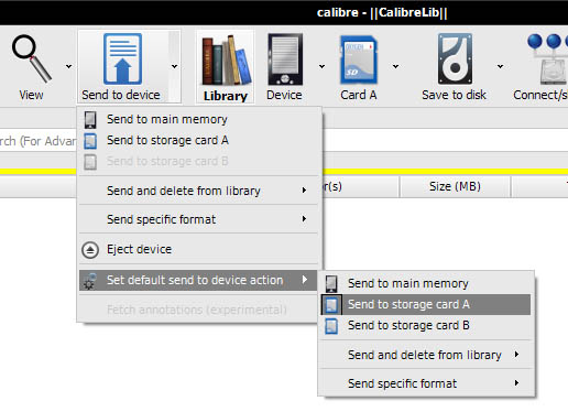 I just figured this out by accident: In the dropdown of "Send to device", you need to set the preferred storage medium in the default send to device action, not in the submenu "Send specific format". See attached.
