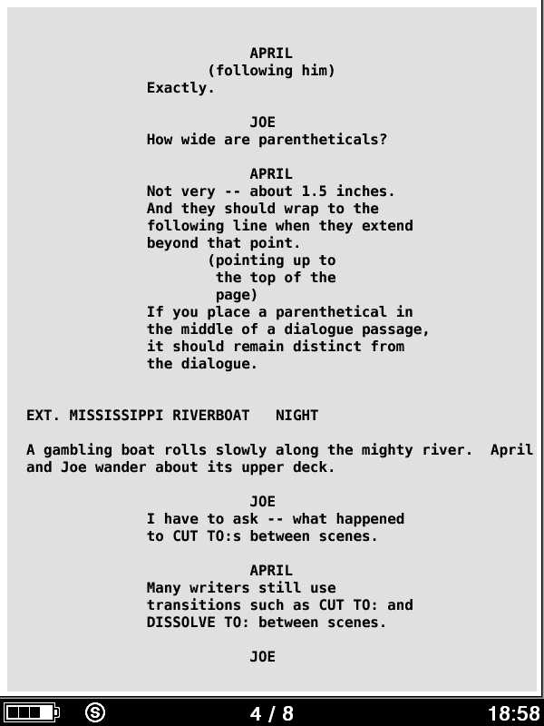 In an EPUB on a Sony reader, by default, the <pre> tags will cause the text to display in the reader's EPUB default monospace font. I'm not sure whether the Kindle has a monospace font, but if not, I'm hoping that it's default serif font will still display the screenplay MOBI OK. The first attached screenshot shows a page of the EPUB in my Sony monospace font. The second shows an EPUB page in the Caecilia serif font which I believe is similar to (the same as?) the Kindle. ...and finally...I'm not sure the purist's would approve of using the <pre> tags because if you zoom too high on your reader the text will disappear off the right-hand edge of the screen. However, if your sample screenplay is typical, the lines seem short enough to get away with it.