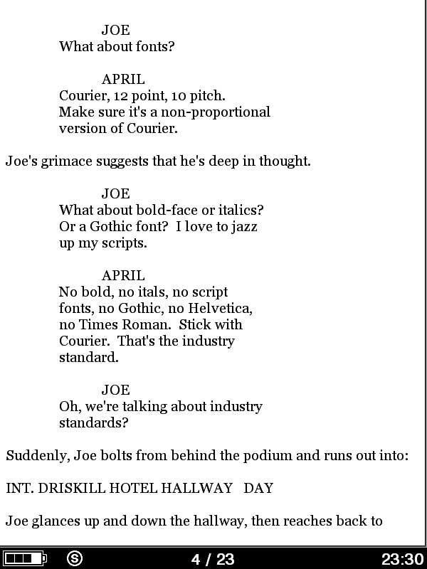 not sure why that is.I suppose I come at this from the other perspective. Both HTML and (I assume) epub formats are/were originally designed to be agnostic on the size and shape of the output device screen. Where I have / am able to get input in a text form direct from Final Draft then I can manipulate things sufficiently to make the transition work. Unfortunately the hard part of this process is the conversion from PDF to HTML - if it was possible in Calibre to tweak how this is performed then one could tag (with separate CSS names the various different styles) one could then manipulate the output to produce something more suitable for the display screen yet maintaining the rules for changing font sizes and rotation. There are tools to find headers and footers on Calibre and Calibre already tags things with multiple css styles so I'm sure there must be a way to crack this. Though I suspect finding an intermediate way from PDF to some format that can be manipulated might be the future. For then your solution looks pretty good and I'll try it today...Thanks. Alan |