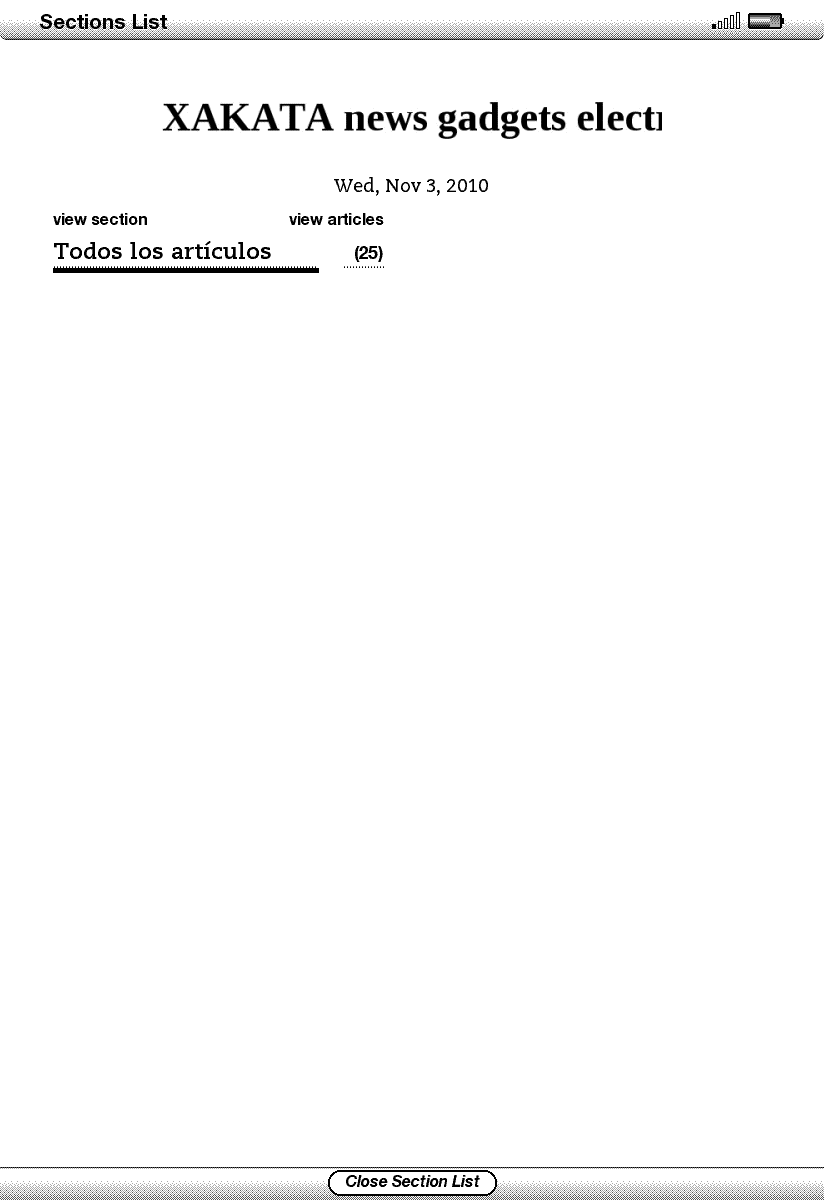 Using the software can create an electronic book of the blog, the style of American news: It looks very good, good job with the RSS on Engadget "XATAKA". "It took 27 seconds to create the book, including recipe ;-) PS is as follows: ![]() ![]() ![]() ![]() ![]() ![]() ![]() ![]() (In the second img, is an "index of articles" rather descriptive, like a newspaper ...) Bye, from Spain. PS: file mobi for DX, but calibre or amazon service can convert for kindle 2 o kindle 3... Last edited by KRorschachZ; 11-03-2010 at 11:51 AM. |