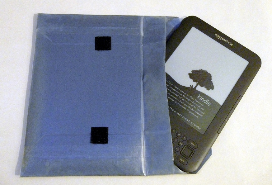 While I like the standard Amazon cover I bought for my K3, I decided to make another one for travel. This design is lighter (at 2.4 oz, less than half the weight), reasonably strong and durable, protects against dust and moisture, and (most importantly) can be decorated however I like!
