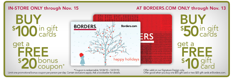 Borders has a promotion (they did this last year before the holidays) where if you buy $50 of gift card (on $50 or 2-$25 USD) you get a free $10 gift card. This is a deal if you buy ebooks from Borders or want to buy a reader. Unsure if this works outside the US; sorry.