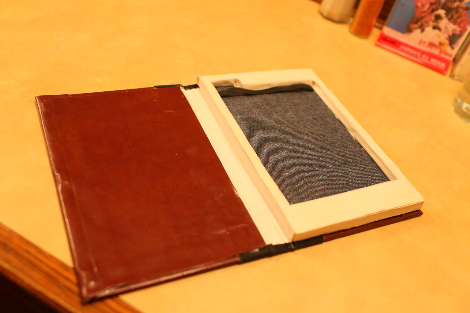 So due to a lack of nice 650 covers, and my disinterest in paying Sony for something that used to be free, I decided to have a go at making a cover. Browsing the B&N's clearance aisle, I found a book the right size, that was just a bit larger then the reader, but gave me a safe margin for cutting (and had enough space for the extra space over the power switch. The book was a standard hardcover, with cardboard covers held together with a thin sheet of bookbinding cloth.