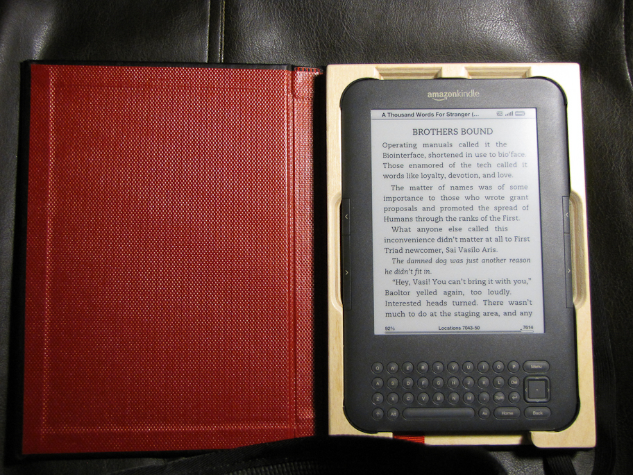 Moleskine, DoDo Case, and finally a newcomer, Pad & Quill. I decided to try my luck with Pad & Quill. At first glance the case does look remarkably like a book ... aside from the strap, which you'll notice is an elastic strap the sort of which Moleskine made famous. Simple to use, but it does manage to keep the case securely closed. The outer covering is black bonded leather -- real, according to the provided insert, and has a nice, relatively smooth feel. It definitely feels more bookish than other types of leather, such as the deeply texturized Oberon cases. Once opened, two pieces of removable paper are attached on either side of the interior to mimic "pages", and are cleverly printed with "care and keeping" instructions as well as company info. That was another quaint little touch that ties in with the book theme. Pad & Quill claims to use "traditional bookbindery techniques" for the construction of their cases. The finished product is as rigid and sturdy as a hardback "dead tree" book, but of a finer quality. More like what you might find in a leather-bound edition. In fact this case doesn't look so out of place setting next to a stack of them. The cradle that the Kindle is set in is actually made of wood, birch to be specific, and is coated in a water based urethane that is supposed to resist staining. The Kindle fits into the cutout with reassuring snugness, without the least bit of wiggle room thanks to the rubber bumpers, one at each corner. These are basically holding the Kindle in place by way of tension and grip, rather than the official clip system or straps that other cases use. This might be a concern for someone who is wary of their device somehow falling out of the case, but from what I've seen so far it is wedged in pretty tight. Due to the materials the case it made out of, it would probably provide poor drop protection due to the lack of cushioning. In fact the included documentation stresses that fact. There are two grooves cut into an angle at the top of the case. These are described as "sound channels", made to direct the sounds of the speaker back towards the reader. They work great too, it was a very clever design feature. Anyone who uses the Text-to-Speech option frequently will find this pretty useful. The same grooves are carved into the case next to the page turn buttons on either side of the Kindle. This is perhaps my only gripe. I have fairly small hands and narrow thumbs, yet I find I have to turn my thumb at an angle to turn the pages now. Sometimes I press straight down using my thumbnail to hit the button, but even that is sort of a pain. It takes away from the easy e-reading experience when you have to "think" about how to turn to the next page. A cutout would have been easier -- from a usage standpoint -- but I understand the reasoning behind the groove design: too many large, ugly cutouts would completely negate the aesthetic 'book' quality of the case. I guess your mileage may vary. The bottom cutout is designed to give full access to all the ports and controls. The usb cord can be inserted while the case is fully closed. Again, the power button might be a little hard for some people to flick. This didn't bother me as much as the page turn buttons, due to the much less frequent use. The red "bookmark" ribbon is actually what is used to remove your kindle; lift up on the ribbon and your kindle pops free. Another important feature that is usually one of the first questions people ask, "Can the front cover be bent to the back?" The answer is, "Yes, easily." Though it feels really strange to do so the first time. This case seems so much like a real book that it feels almost perverse to bend the cover around like that, because no sane person would ever do that to a real book. Price: $44.99 Rating: 4 out of 5 Pros: