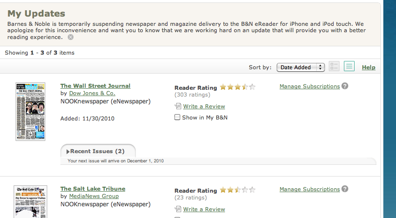 My Updates Barnes & Noble is temporarily suspending newspaper and magazine delivery to the B&N eReader for iPhone and iPod touch. We apologize for this inconvenience and want you to know that we are working hard on an update that will provide you with a better reading experience. Does this mean an update of some sort if on the way? I'm new to the nook so I don't know if this is a routine message or not... |