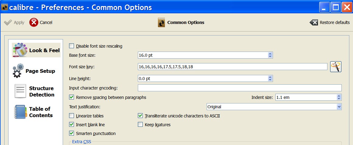 I have tried something along the lines you suggested (limited key) before but I will try your suggestion as well. I selected three books that have different font sizes on the Sony and opened them in Firefox (EPUB reader) as well as Adobe Digital Editions. The fonts all look the same. I also increased and decreased the font sizes in these books and retried them in Firefox and Adobe and I can see the changes. So the problem seems to be related to my Sony. Which device should I select for output to the PRS 650 (I now use plain Sony Reader)? |