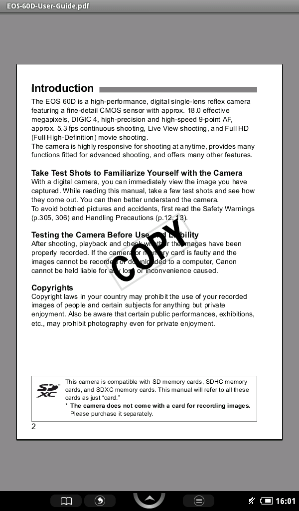 I have several Canon user guides for my various cameras and each is a PDF file. They all display well on a computer. But everyone of them shows a huge slanted box with "Copy" on each page when viewed in an ebook reader. The PDFs are locked of course, so I cannot figure out how to deactivate/hide that layer. Has anyone seen this in PDF files and is their a way to hide the copy layer? It is quite annoying when trying to read the manuals. It isn't like these are purchased items Canon doesn't want shared. I understand that Canon would want to lock them to prevent someone from changing the text, but surely there is a way to get rid of the copy layer. ... Last edited by jswinden; 12-20-2010 at 06:04 PM. |