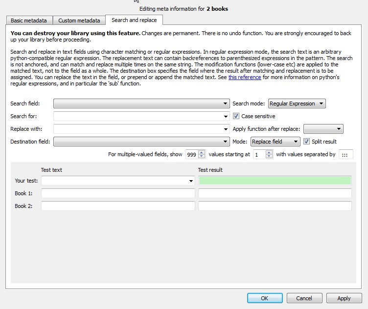 Here is the scenario I am considering. Often when I import books the isbn shows up as the title. It would be nice if in the search & replace page you could have a way to replace one field with another. Sounds simple enough.