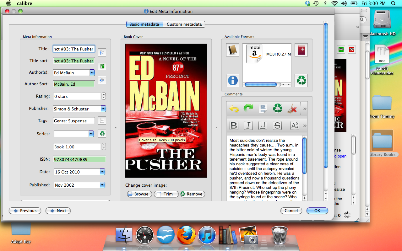 1) Tried dragging in between the columns. As I said before, it then turned into arrows, but as soon as I let go of the mouse, it springs back leaving me just as constrained as I was before 2) Tried just making that whole dialogue box bigger. It worked in the moment, but once I closed the edit metadata dialog, it did not remember the settings and next time I went to open it, everything was as before. I am attaching a screenshot. As you can see, I need more room to see the text fields. I cannot edit books this way. I was just on vacation and have a backlog of 70+ books to add, so I do not relish manually re-adjusting the size of the dialog window every time I add a book. I don't care about seeing anything more than a tony thumbnail cover in this view; I use cover flow when I want to look at covers. I don't need it taking up a third of the screen real estate! I just want back the screen I had before