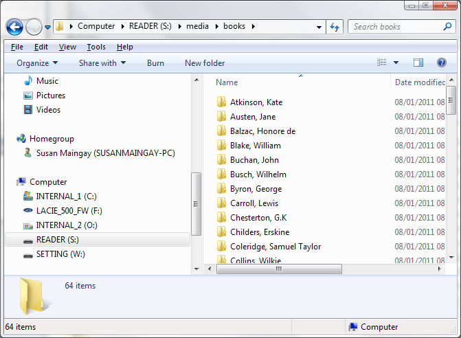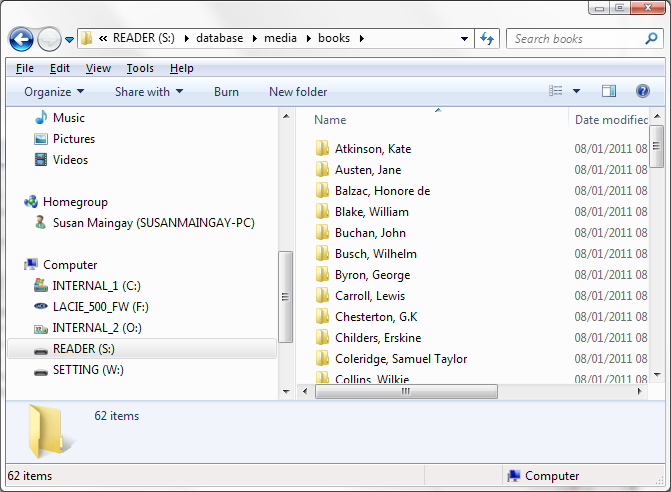 {author_sort}/{title} - {authors} ... so at least this is consistent. I'm wondering if the slightly odd folder structure arises after "russification"... At the moment on my PRS-650 my books are stored in one location only: S:\database\media\books ... so at least I'm in the default place. There is also, and confusingly, a (now empty folder) at S:\media\books. As it's empty and not causing problems I'll work on the "if it ain't broken, don't try to fix it" principle - and accept a little uncertainty in my life ![]() Best C: |