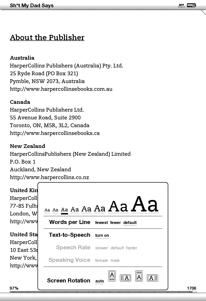 Like for one book, fonts 2 and 5 will do it, for another only font 3, for another only fonts 1 and 4, etc. I think it has something to do with the conversion because books that I download off of feedbooks always have screwed up size #3, and epubs I convert with calibre always have screwed up font #2 and #4. Anyways, this never used to happen before the most recent firmware. Last edited by curstpriest; 01-23-2011 at 12:23 AM. |