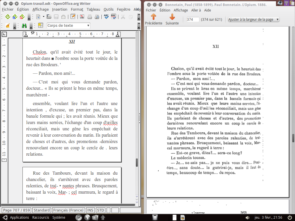 Edition Un nouveau titre : L'opium de Paul Bonnetain. https://www.mobileread.com/forums/sho...14#post1391214 Vous pouvez aussi le trouver ailleurs, à des prix d’extorsion (156 € ). Après tout, il s’agit d’un livre rare, donc cher... ![]() http://www.wanted-rare-books.com/pau...in-l-opium.htm Technique L'EPUB a été créé avec OpenOffice, puis converti avec l'extension writer2xhtml . Sigil a été utilisé uniquement pour les méta-données (voir post plus haut) . J'ai utilisé une macro typographique appelée TypoPat dont je vous laisse juger les résultats. J'ai rajouté deux copies d'écran: La première pour montrer comment se passe en pratique l'essentiel de la comparaison (Ubuntu Maverick). Sur cette copie d'écran, l’image de Gallica est excellente, compte tenu de l’âge du livre, ce qui influe favorablement sur la qualité de la reconnaissance. Si l’on dispose d’un OCR de qualité et donc d’une bonne base de travail, la restauration avec OO se fait le plus souvent à vitesse de lecture et permet de rester en même temps attentif à l’intrigue. Tout cela se fait sans stress, à votre rythme. Le temps nécessaire dépend du volume de l’ouvrage, de la qualité de l’image, et surtout de l’intérêt que vous y trouverez. La seconde image est la fenêtre de dialogue de writer2xhtml, qui, vous le voyez, ne vous donnera pas mal de tête. Bonne lecture Last edited by roger64; 02-12-2011 at 09:58 PM. |