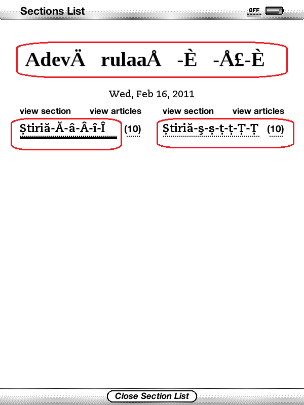 For testing i create a recipe where title is: title = u'Adev\u0103rulaa\u015f-\u0219-\u0163-\u021b-\u0162-\u021a-\u0103-\u0102-\u00e2-\u00c2-\u00ee-\u00ce' and feeds: feeds = [ (u'\u0218tiri\u0103-\u0102-\u00e2-\u00c2-\u00ee-\u00ce', u'http://www.adevarul.ro/rss/latest'), (u'\u0218tiri\u0103-\u015f-\u0219-\u0163-\u021b-\u0162-\u021a', u'http://www.adevarul.ro/rss/latest') ] The title in documents list is ok but when i open the book and check Section list the title is wrong but feeds are ok. I attach a print screen. |