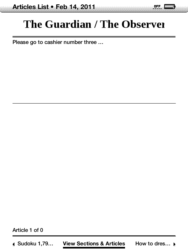 After trying the new 3.1 Kindle firmware, I've notice Calibre generated publication files (recipes) don't behave totally correct with the new publication layout. More especifically, when navigating to the main title page, in any situation, the selection is always on the first section/article. It should be the last section/article selected.