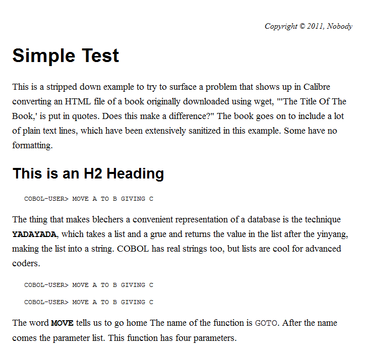 I'm having trouble getting Calibre to do a basic single-file HTML to epub conversion. I think this may be a CSS-related bug in Calibre 0.7.48 (Win7-64), but since everything I know about HTML and CSS was learned in the last few hours trying to sort this out myself, the problem could well be the nut behind the wheel -- I don't know enough to file an actual bug report :-)