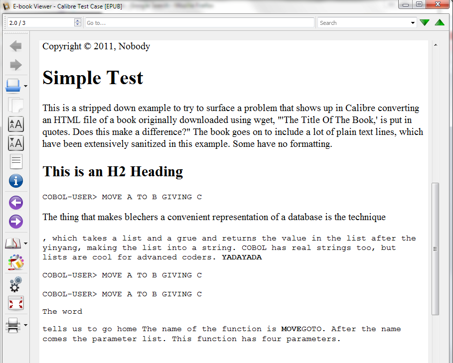 Calibre seems to get confused when combining in-line HTML boldface formatting with the "white-space" CSS construct: code { white-space: nowrap; } That is, when style.css includes the above, Calibre's formatting is thrown off by HTML like <CODE><B>Pragma</B></CODE> The epub book that Calibre generates will display the code somewhere on the page other than inline. I'm attaching screenshot .png files to show the source HTML displayed in Firefox 3.6.15 and the epub as displayed by Calibre's built-in viewer. Those screen shots come from a very stripped down HTML file and the actual style.css file for the book I was trying to convert. I'm attaching those files as well (camouflaged as .txt to make the Forum software happy.) Please let me know anything else that would be helpful. |