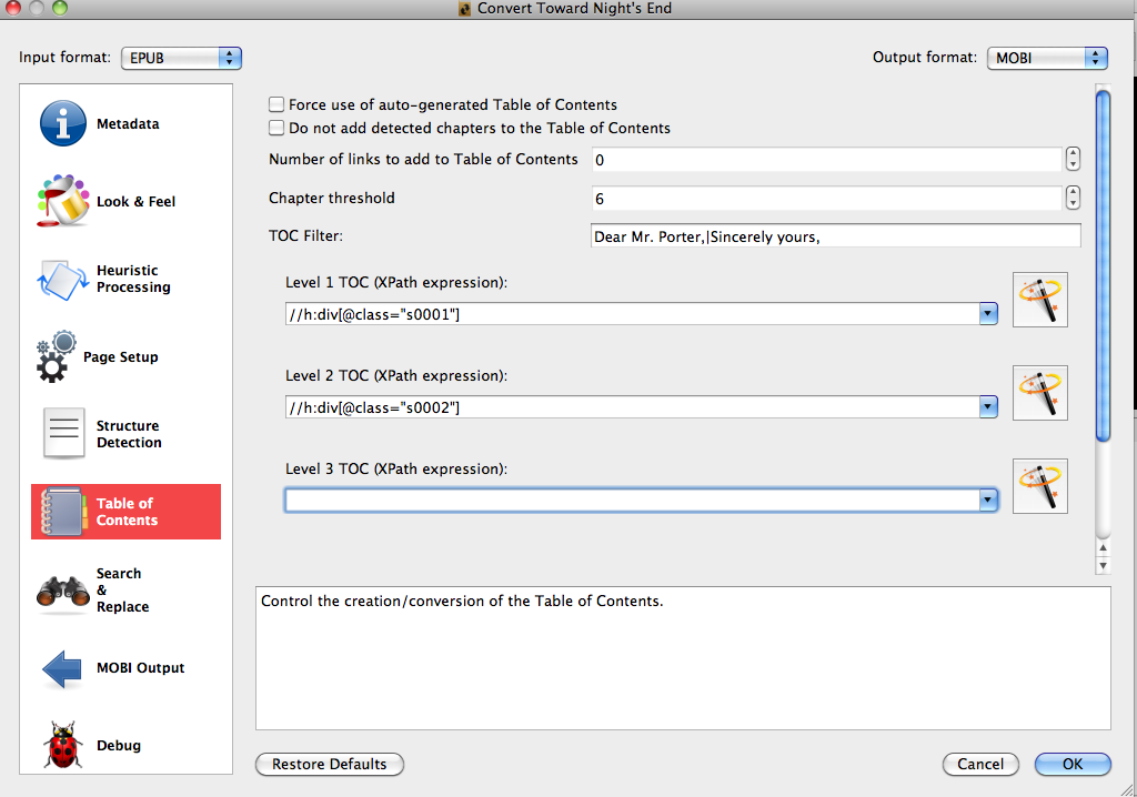 Quandary continues. UPDATE Monday, 5/16/11: Just installed the 0.8.1 update that came out, hoping it would magically resolve my issue, but alas no. Still need some guidance. Again, from what I can tell, Caliber, when converting from either RTF OR ePub to Mobi is only converting Chapters, Subchapters, and specially formatted text. HELP ASAP. UPDATE: UNKNOWN REASON FOR RESOLUTION: Okay, so I found the older version of the mobi file where it was all correct. I put that back into Calibre, then converted IT to an RTF. Updated the RTF with the latest edits, then re-generated the mobi. File fine, but no TOC. Added back the original TOC XPATHs, and voila! How weird is that??? Last edited by hollowayhouse; 05-16-2011 at 11:42 AM. Reason: Updated info. |
