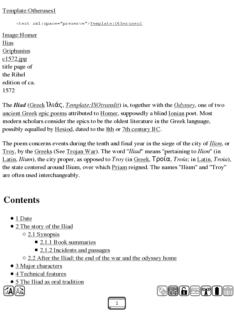 root@ereader:/mnt/cf/offline.wikipedia# ./mywiki.pl iliad 0: (abort) 1: (100%) Iliad 2: (72%) The Iliad 3: (72%) Little Iliad 4: (72%) Ambrosian Iliad 5: (63%) Category:Characters in the Iliad 6: (63%) Wikipedia:Articles for deletion/Ambrosian Iliad 7: (63%) Wikipedia:Votes for deletion/Ambrosian Iliad Select a number: 1 Code: