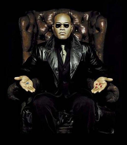 <Extends to hands with a blue pill in one and a green pill in the other> "Take the blue pill, you wake up in your bed and believe what ever you want, take the red pill and and I show you just how deep the rabit hole goes."