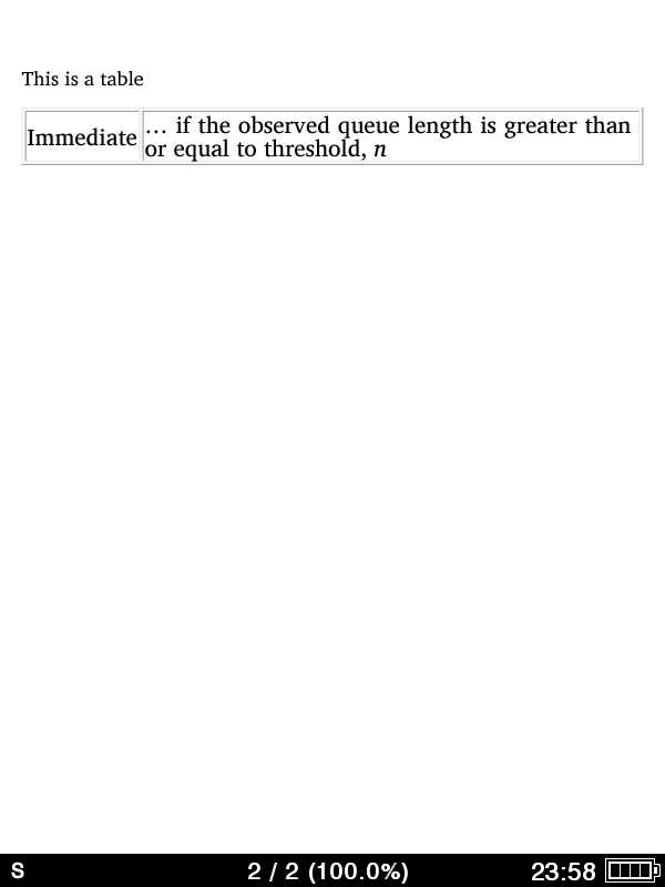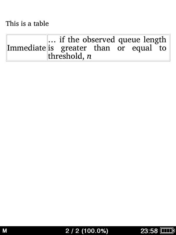 I am using Calibre to convert the same HTML file to create an epub file. I am then viewing the results on an ipad or Mobipocket Reader on a PC. Text in table cells displays correctly in my HTML file and in the prc file; however, this same HTML produces truncated table cells in the epub file when viewed with an ipad or Mobipocket Reader (using Paper Book Aspect Ratio or any of the other settings other than Full Width). (The table text displays correctly only when I select "Full Width" with Mobipocket Reader--the table cells truncate in the other views.) The HTML code is clean: <table border="1" > <tr> <td valign="top">Immediate</td> <td valign="top"> ... if the observed queue length is greater than or equal to threshold, <em>n</em></td> </tr> </table> |