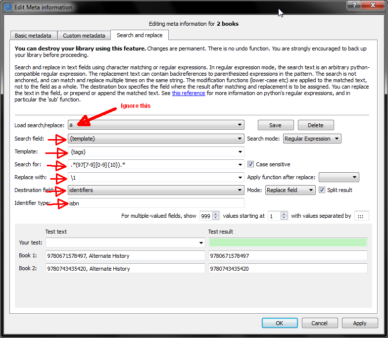 but doesn't actually write the metadata. I could do the same by enabling series in the basic metadata section but not all the series titles are in my collection, maybe I have from 1-20 and then 24-40 so if i make it the basic way it autoadds the 24-40 as 21-36 , that's why I wanted to use the regexp in search and replace. Could anyone help me? Last edited by noimporta; 04-29-2011 at 12:38 PM. Reason: sorting the code in quotes |