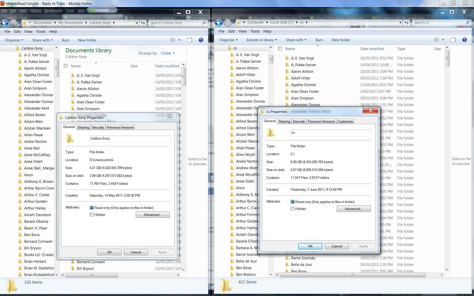 Then my assumptions and reasoning are incorrect? In that case I am completely at a loss as to what is happening. I know that when I use WE to look at the directory, or to copy / paste the library elsewhere, a fairly large number of files do not show themselves, and are missing from the copy that I have made. I can think of no other reason that could cause this problem. The attachment shows the original library (on the left) and a copy with a much shorter pathname, made by using the Welcome Wizard, from the source on the left. You;ll notice that although similar, they are not the same. WE shows just 320 items at the bottom of the left hand one, while the right hand one (the copy of the left hand library) shows 421 items, and if you look at the bottom of the left hand image, Barack Obama is followed by Beam H Piper, and then Ben Bova, while the right hand image shows Obama followed by Barbara West, Barrie Sosinsky, Belle de Jour and then Ben Bova. Which brings me to the second issue. I currently have no books in Calibre by Beam H Piper, but I didn't use the Remove Books command to delete his books - I used the Windows Delete key. To me, it looks as though the Delete key will only delete the entry from Calibre, while the Remove Books command will remove them from file, as well. Hence lost authors and lost books. The copy using Calibre's wizard, by the way, appears to have copied all books that are showing in Calibre, (and left behind those that weren't in Calibre) even if they don't show up in WE, while WE copy / paste copies everything that's there, minus the "hidden" books. Suggestions please? |