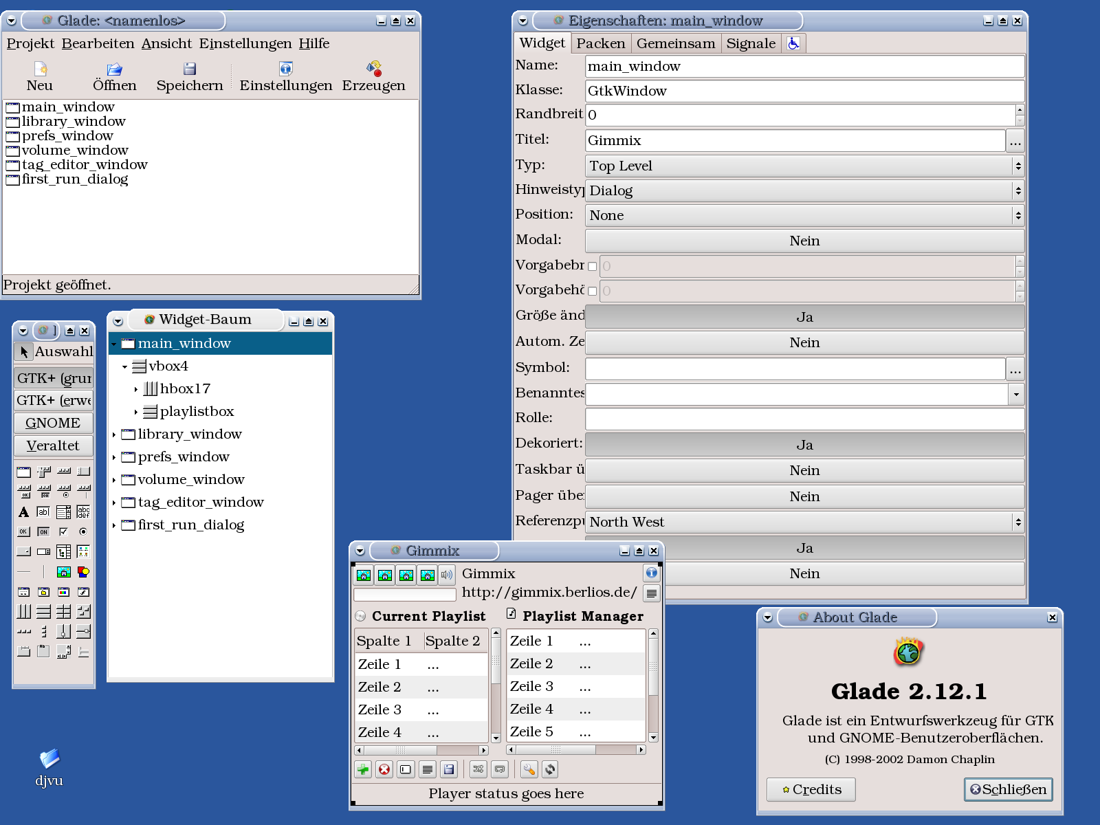 Fixing the glade interface solves this. ![]() Right now I am struggling a bit withe the glade program. I want to get the 2 right vbox buttons in the top hbox to get a much smaller window. I have the feeling it is easier to edit the xml file directly. ![]() The artist/song title will be disabled in next version for the same reason. The version of glade with comes with openSUSE 10.3 is pretty old & has got no undo feature. ![]() Compiled recent version of gimmix doesn't start because it can't find a shared library. ![]() # Screenshot shows the program glade which can be used to edit the interface of gimmix. [openSUSE 10.3, German localisation]. [EDIT] Current old version of jukebox uses non stripped libraries.
