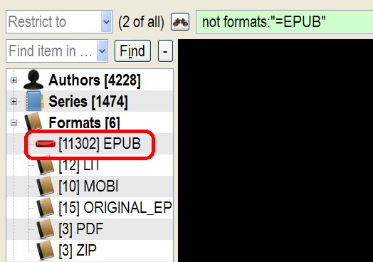 not formats:EPUB formats:true As an aside, it's also worthwhile knowing the following special characters that can follow the colon or appear inside the quotes in a search: = for exact matches only < or > for numerical or date comparisons # for counting is_multiple (number of formats or tags so formats:#1 finds books with a single format of any type) ~ for regular expressions An example of the less well known "#" - this will find books that have only the text format and no others: formats:TXT formats:#1 |