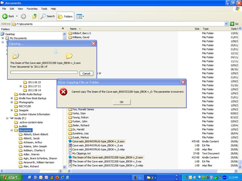 Tried copying books from Kindle via Windows Explorer to my PC but came up with error attached.