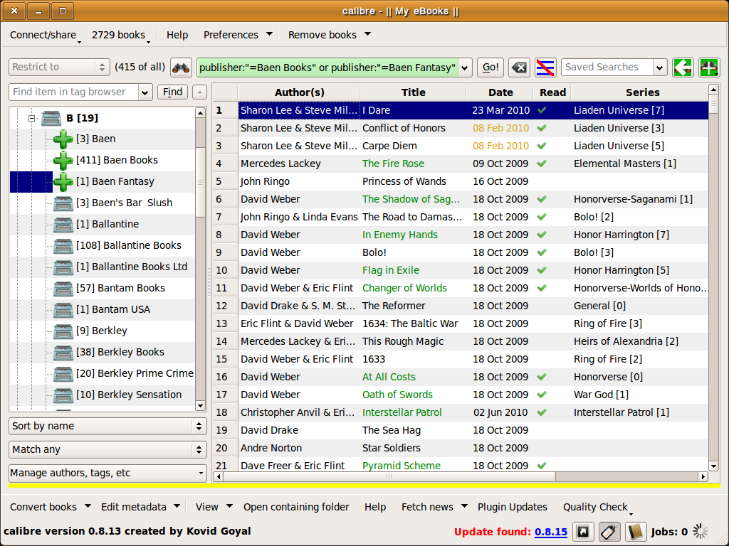 Author: I thought about perhaps matching a controllable number of characters in the sirname and grouping but to simplify, it would probably need to just match the sirname. There will be lots of false positives but faster than searching through a monster list. Publisher - Match first word - display any non-matches. In your example, the first 3 would come up as matches, all 3 Ballantine, Both Bantam, etc. Most of the non-conformity I see in publishers is someone truncating their name in metadata or the company expanding it later. Forget I mentioned series - I only have about 100 of those - it'll be faster to do it by hand probably. Working with the Manage authors, tags, etc. is ok for some tasks but seems very limited |