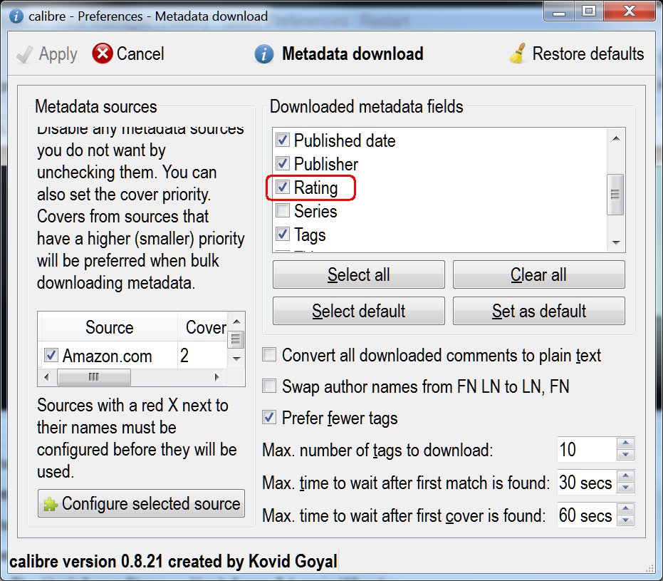 I checked and it seems my settings screen for Metadata download is different from the one you show, but the content looks similar. The Ratings box is checked, so that isn't it.