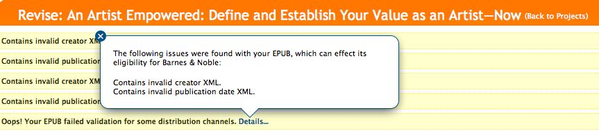 1. ERROR: test_preview_empowered_10_8_11.epub/OEBPS/toc.ncx(92): assertion failed: different playOrder values for navPoint/navTarget/pageTarget that refer to same target Going back to the original error: 1. ERROR: preview_empowered_10_8_11.epub: could not parse OEBPS/Text/05_chapter.xhtml: duplicate id: heading_id_3 Here is the code. Where is the error? <?xml version="1.0" encoding="utf-8" standalone="no"?> <!DOCTYPE html PUBLIC "-//W3C//DTD XHTML 1.1//EN" "http://www.w3.org/TR/xhtml11/DTD/xhtml11.dtd"> <html xmlns="http://www.w3.org/1999/xhtml"> <head> <title>An Artist Empowered</title> <link href="../Styles/template.css" rel="stylesheet" type="text/css" /> <link href="../Styles/page-template.xpgt" rel="stylesheet" type="application/vnd.adobe-page-template+xml" /> <style type="text/css"> /*<![CDATA[*/ p.sgc-4 {margin-top: 0.4em; margin-bottom: 1.2em; page-break-inside: avoid; text-indent: 0px; font-size: 11px; text-align: left; margin-right: 0em; margin-left: 2em;} p.sgc-3 {margin-top: 1em; margin-bottom: 0.1em; page-break-inside: avoid; text-indent: 0px; font-style: italic; text-align: left;} h1.sgc-2 {font-size: 17px; text-align: left; color: rgb(0, 153, 255); margin-top: 0em; margin-right: 0em; margin-bottom: 0.5em; margin-left: 1em;} span.sgc-1 {font-weight: normal; text-transform: none; font-size: 14px;} div.sgc-7 {font-size: 120%} span.sgc-6 {font-size: 120%} span.sgc-5 {font-size: 14px} h3.sgc-10 {font-size: 120%} span.sgc-9 {font-size: 14px;} span.sgc-11 {font-size: 17px;} /*]]>*/ </style> </head> <body> <div id="x05-chapter"> <h1 class="chaptertitle" id="toc-anchor"></h1><span class="sgc-1">5: A NEW POSTER CHILD</span> <h1 class="chapter-subhead sgc-2" id="heading_id_2"><span class="sgc-1">Artist as Hero</span></h1> <p class="sidebar-quote-sj1 sgc-3"><span class="sgc-1">The act of rejection, as well as acceptance, is based on subjective criteria and has nothing to do with your value as an artist, or as a human being.</span></p> <p class="sidebar-author sgc-4"><span class="sgc-1">CAROLL MICHELS</span></p> <p class="sidebar-author sgc-4"><span class="sgc-1"><br /></span></p> <p class="sidebar-author sgc-4"></p> <h3 class="sidebar-author sgc-4" id="heading_id_3"></h3><span class="sgc-1 sgc-6">Buy the complete book: print or </span><span class="sgc-11">eBook</span> <h3 class="sidebar-author sgc-4" id="heading_id_3"><span class="sgc-1 sgc-6">An Artist Empowered: Define and Establish Your Value as an Artist—Now</span></h3> <h3 class="sidebar-author sgc-4 sgc-10" id="heading_id_3"><span class="sgc-9">By Eden Maxwell</span></h3> <h3 class="sidebar-author sgc-4 sgc-10" id="heading_id_3"><span class="sgc-9">“Eden Maxwell’s art is brilliant; he’s the real thing, a true creator.” </span></h3> <h3 class="sidebar-author sgc-4 sgc-10" id="heading_id_3"><span class="sgc-9"> —Mary Anne Bartley, Artist-in-Residence: Villanova University, WHYY, PBS</span></h3> <div class="sgc-7"> <br /> </div> </div> </body> </html> |