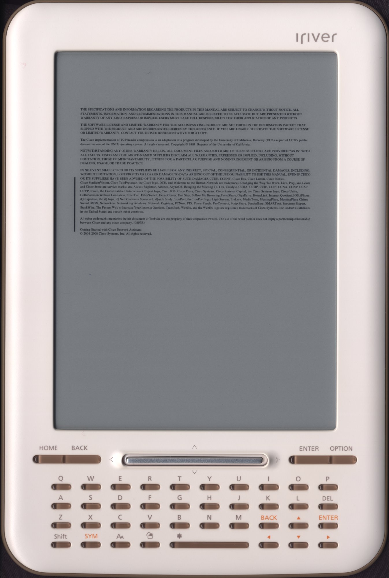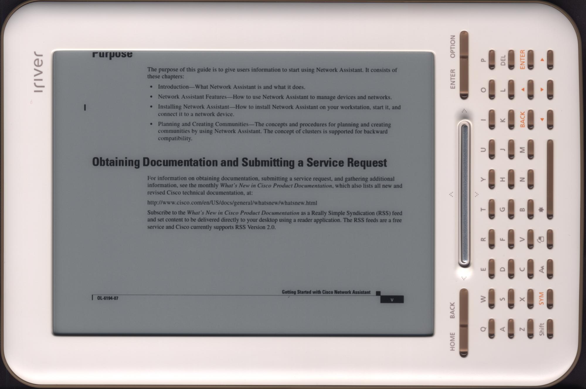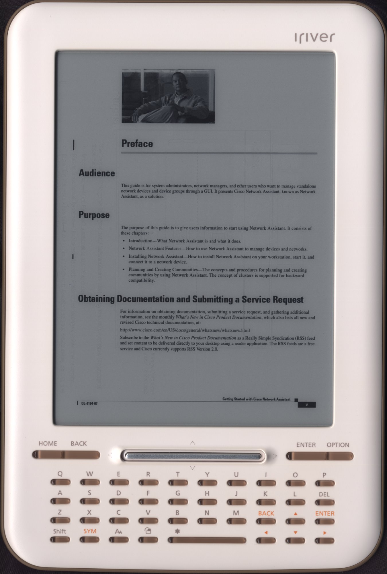 OK, I was thinking about a Kindle DX so that the full screen display of letter sized PDF will work reasonably well, but I did some research on the little iRiver and noticed that the advertised resolution is much higher than other 6 inch e-readers approaching the resolution of the DX and the same as the tablet computer I am currently using for this task. Normally when I need to print a PDF I print them Booklet style (four pages per sheet) and that size seems fine to me as long as the text is clear. Which brings me to my question...