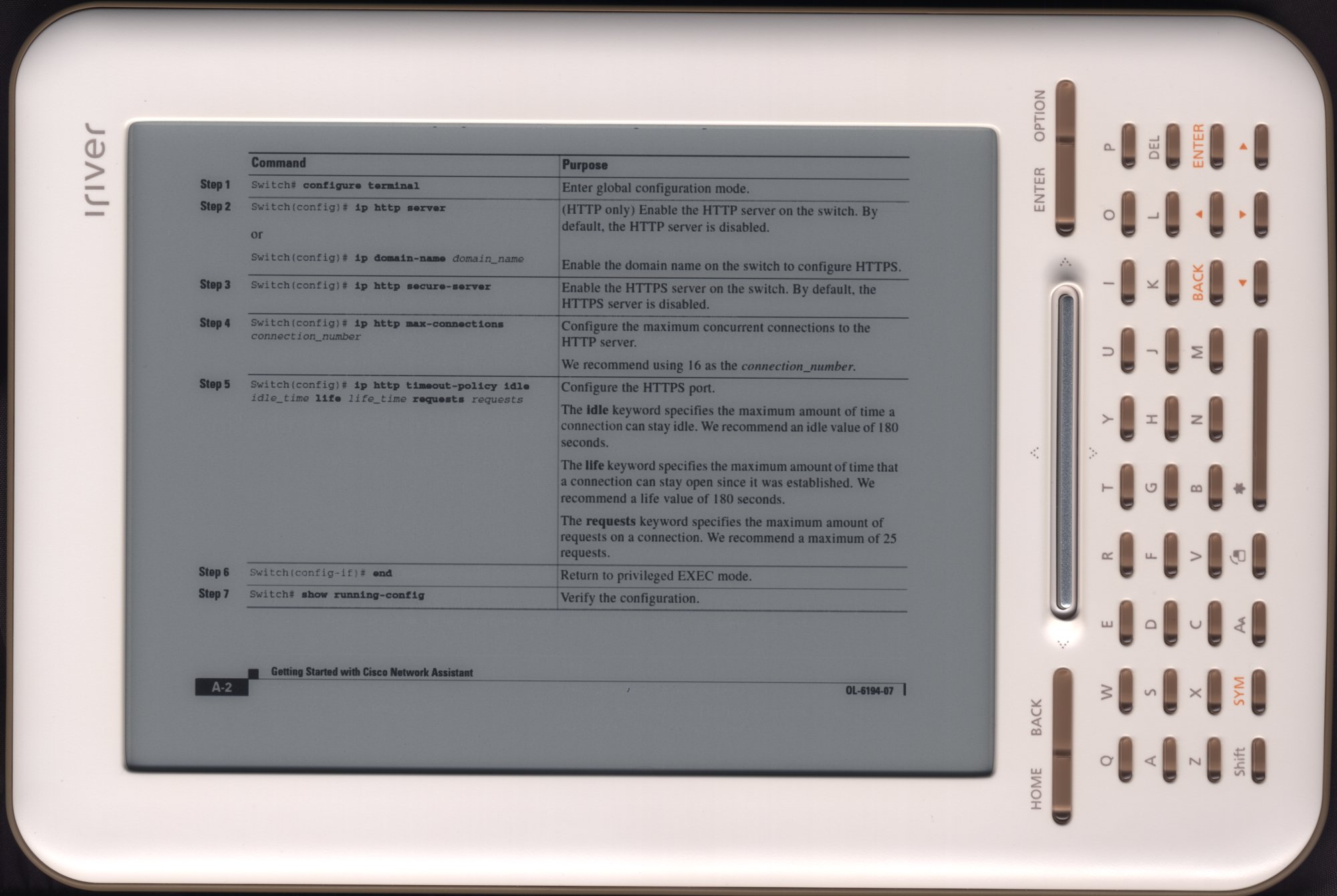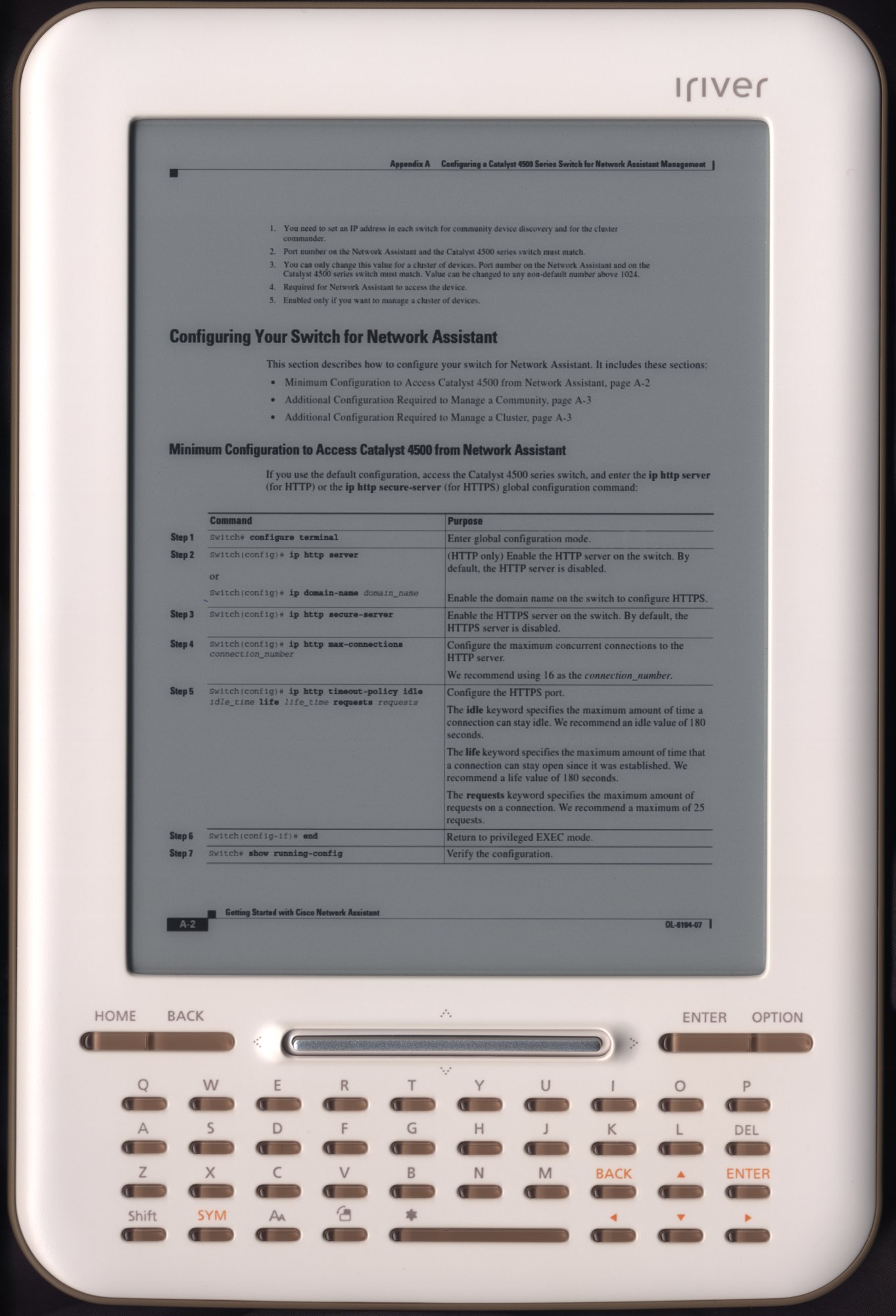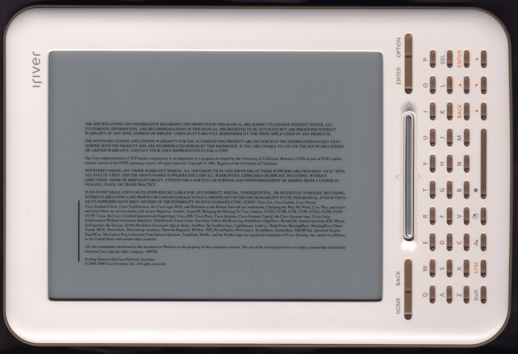 OK, I was thinking about a Kindle DX so that the full screen display of letter sized PDF will work reasonably well, but I did some research on the little iRiver and noticed that the advertised resolution is much higher than other 6 inch e-readers approaching the resolution of the DX and the same as the tablet computer I am currently using for this task. Normally when I need to print a PDF I print them Booklet style (four pages per sheet) and that size seems fine to me as long as the text is clear. Which brings me to my question...