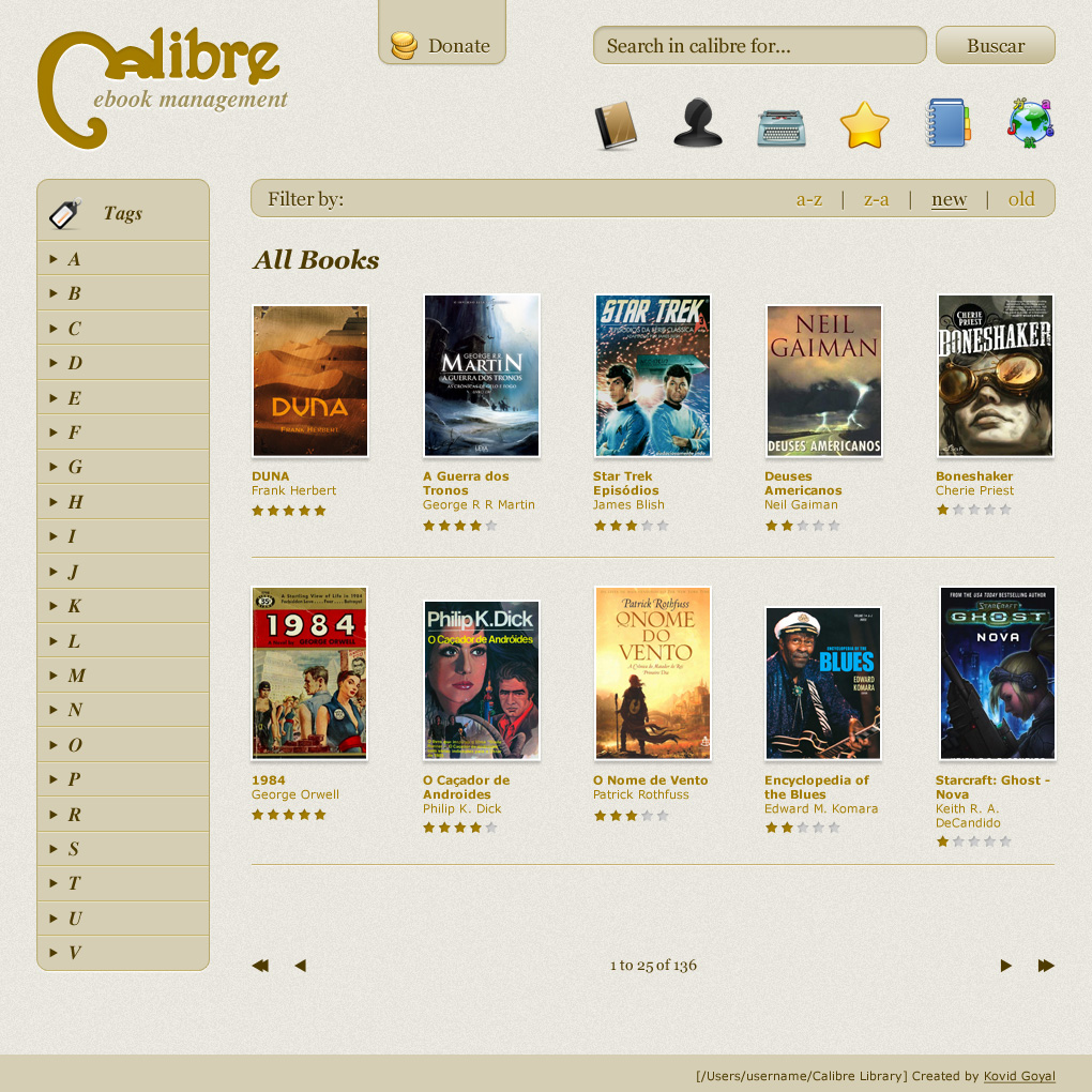 I want to help the calibre community but i don't know how to programm. So I was thinking that i could help with the calibre web interface, since i know HTML/CSS. I did a little sketch about a new interface, its not finished, i need to put some more contrast to it, i think its too... boring? ![]() I was thinking in redraw the icons too, what you people think about it? Ideas are very welcome! ps: sorry about my english, its rusty... very rusty