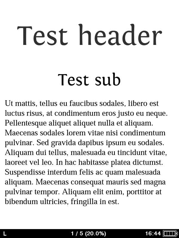 I've found the culprit: I had some css files on my Sony that I put there when I installed another custom firmware (probably Boroda). And it was these files that I inspected for some h1 override font. There was nothing there. (Hence my surprise: I specified a custom font in the epub ccs, and it simply ignored it...)But obviously, Prs+ takes its css files from another folder. And there I found a "font-family" item for all h1 headers. ![]() I'm quite happy that this is solved!