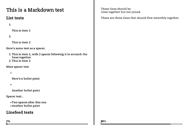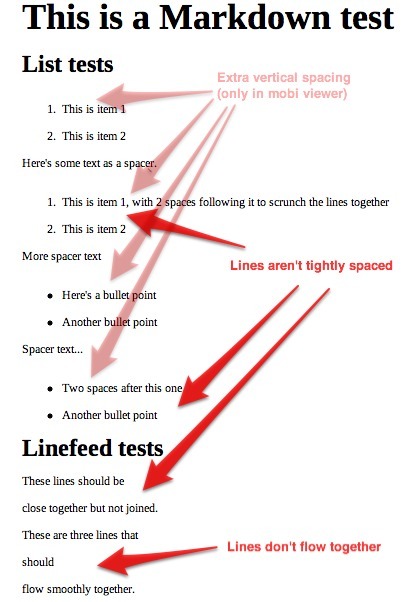 # This is a Markdown test ## List tests 1. This is item 1 2. This is item 2 Here's some text as a spacer. 1. This is item 1, with 2 spaces following it to scrunch the lines together 2. This is item 2 More spacer text * Here's a bullet point * Another bullet point Spacer text... * Two spaces after this one * Another bullet point ## Linefeed tests These lines should be close together but not joined. These are three lines that should flow smoothly together. Here's BBEdit 10's preview, which looks fine: ![]() After doing a Txt --> Mobi conversion in calibre, this is what the Mobi viewer shows: ![]() And here's what it looks like on the Kindle 3: ![]() I see these problems:
